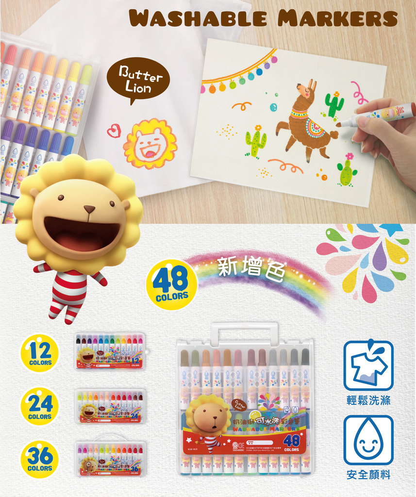 【奶油獅可水洗彩色筆】採用可水洗無毒顏料,如果不小心畫到皮膚、衣服、床單等等,只要用清水、肥皂或一般洗衣劑就能輕鬆洗淨,怎麼畫都不怕弄髒喔!同時,色彩飽和度高,讓您和孩子們輕鬆享受畫畫的樂趣!