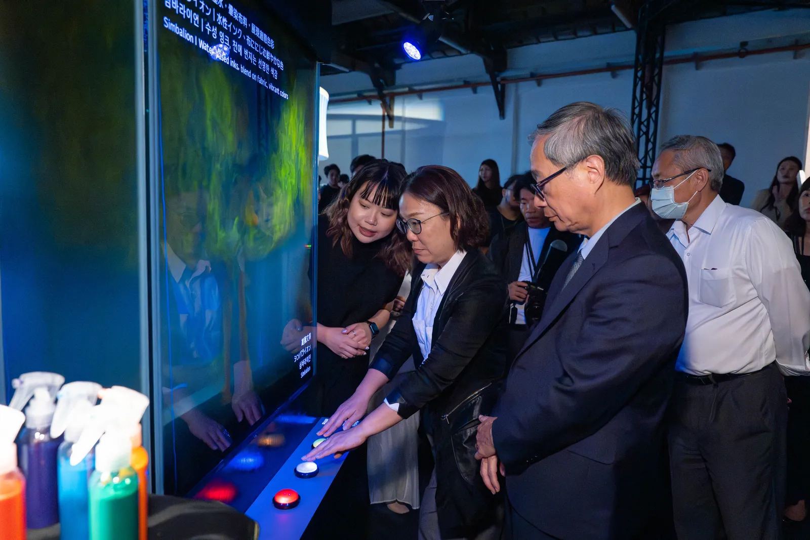 文化部長李遠及文化部政務次長王時思於「色彩意象區」親身體驗雄獅裝置。