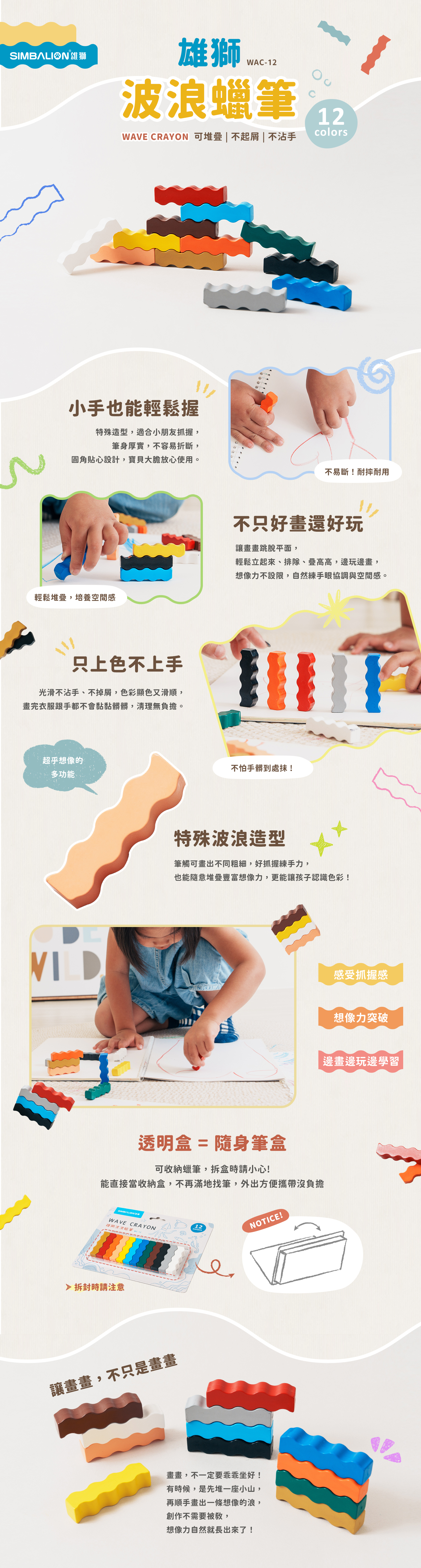 讓畫畫,不只是畫畫! 雄獅波浪蠟筆將繪圖與遊戲完美結合。專為學齡兒設計的波浪造型,不僅好握、防滑,更能多角度描繪出豐富律動感。這款蠟筆能像積木一樣立起堆疊,讓孩子在色彩創作中同時激發想像力與立體空間思維。滑順不沾手的特性,讓每一次創作都乾淨自在,是陪伴孩子探索色彩世界的最佳玩伴,送禮自用都適合。